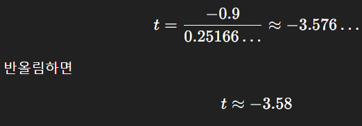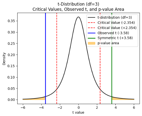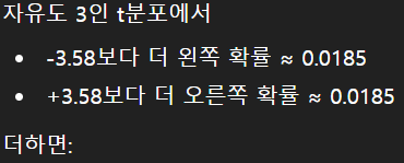 “t = -3.58은 기각역에 속하여 귀무가설은 기각된다.”