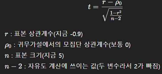 검정통계량 t = -3.58은 기각역에 속하여 귀무가설은 기각된다. 따라서 지각횟수와 국어성적은 상관관계가 있다.